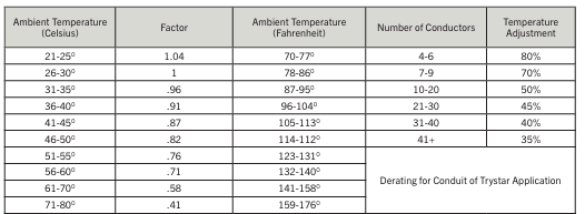 Adjustment for more than three current carrying conditions: The values listed above are based upon ambient temperature @ 30°C (86°F). Values are for single conductors, where the individual conductor is not installed in raceways or physical contact with each other except in lengths not exceeding 24.0 inches. For ambient temperatures other than 30°C (86°F) multiply the allowable ampacities stated above by the appropriate conversion factor listed below.